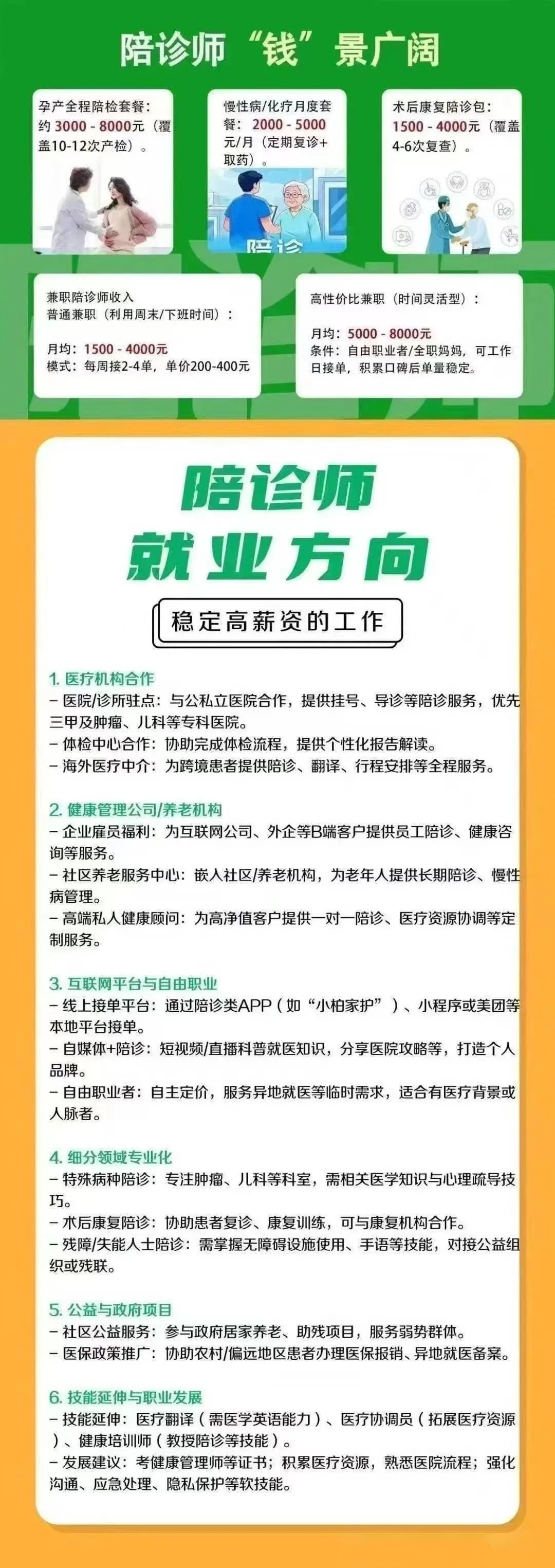 2)无准入门槛,目前无专业限制条件,只要考取证书,人人都可成为陪诊师。